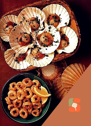 Смажені морські гребінці та кальмари