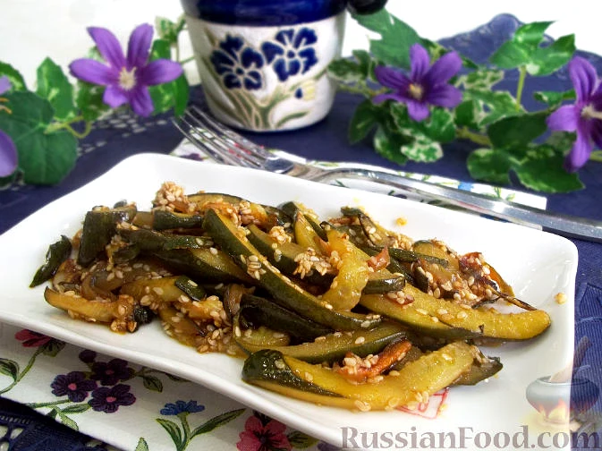Додамо насіння кунжуту, знову перемішуємо та просмажуємо близько 3 хвилин. Смажені огірки готові, подаємо пікантні огірочки до столу.