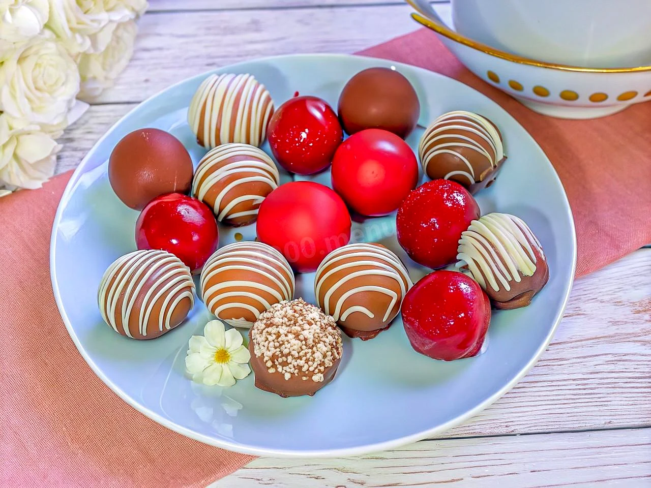 : У довільній формі прикрасьте цукерки Також можете використовувати для прикраси кондитерські посипання, подрібнені горіхи, кокосову стружку, сублімовані ягоди та фрукти та навіть морську сіль.