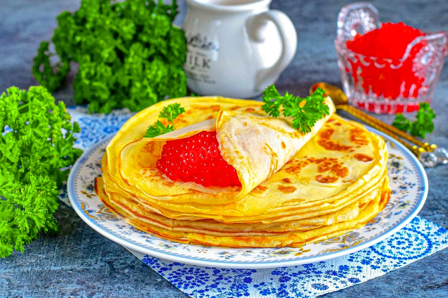 Як подати царські млинці до столу? Готові ситні млинці викладіть чаркою на блюдо і подавайте до столу. Я подавала з червоною ікрою та зеленню. Варіанти подачі (LSI) Також гарячі царські млинці ідеальні зі сметаною, вершковим маслом та слабосоленою сьомгою. Ласунам сподобається варіант із сирним сиром, ягодами, варенням або згущеним молоком. Приємного апетиту!