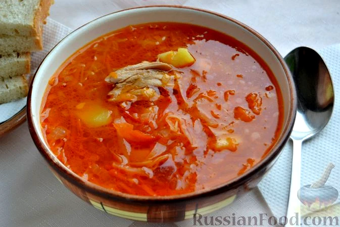 Рецепт Борщ з куркою (без буряка), склад: м'ясний набір (курячий суповий), картопля (2 шт.), капуста білокачанна, морква (1 шт.), цибуля ріпчаста (1 шт.), перець болгарський червоний (1/3 шт.), тост,…