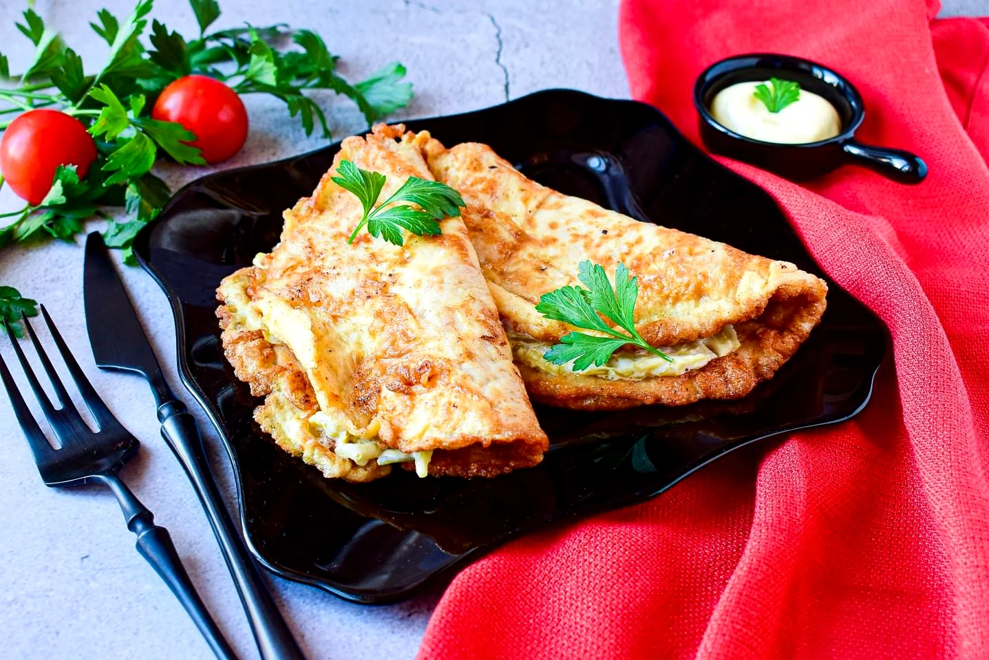 : Готовий бризоль зніміть на тарілку і відразу гарячий складіть навпіл. Так приготуйте всі бризолі.