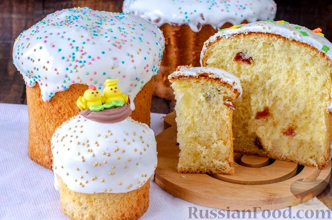 Рецепт Швидкі паски без замісу, з цукровою глазур'ю на желатині, склад: Для тесту: молоко, вершкове масло, дріжджі сухі, жовток, борошно, цукор, апельсин (цедра і сік), курага, родзинки, журавлина су…