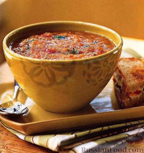 Рецепт Гаспачо пряний, склад: помідори жовті (різані кубиками), огірки (очищений від насіння, кубиками), перець болгарський жовтий (різаний кубиками), перець болгарський червоний (різаний кубиками), …
