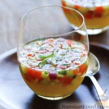 Рецепт Гаспачо з ананасовим соком, склад: ананас, перець болгарський червоний, огірки, цибуля ріпчаста червона, чилі, кінза свіжа, сік лимона свіжий, сіль морська;, Рецепти перших страв, Гаспачо, Суп…