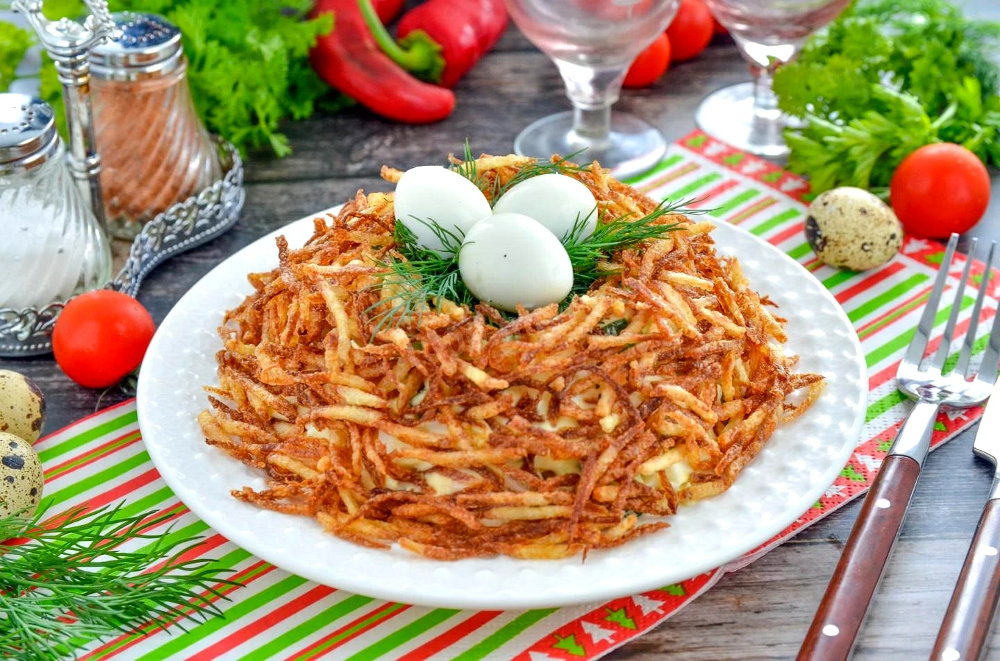 : Приліпіть з боків салатної гірки обсмажену картоплю, імітуючи пташине гніздо. На кріп викладіть очищені перепелині яйця.