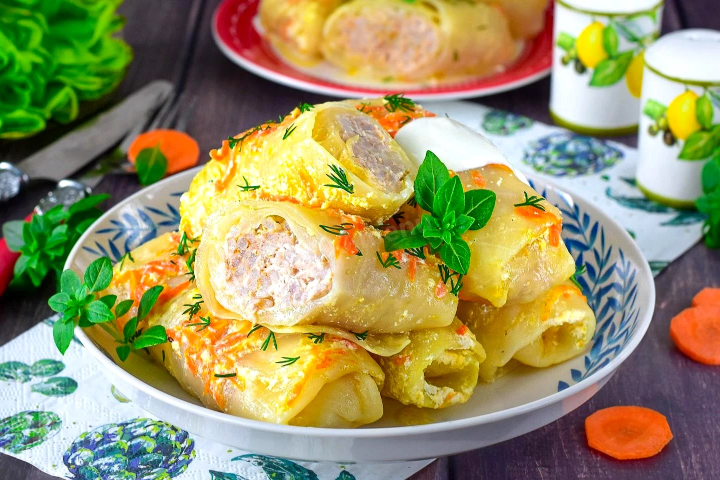 : Готові голубці розкладете по тарілках, посипте подрібненою зеленню та подайте до столу зі сметаною. Приємного апетиту!