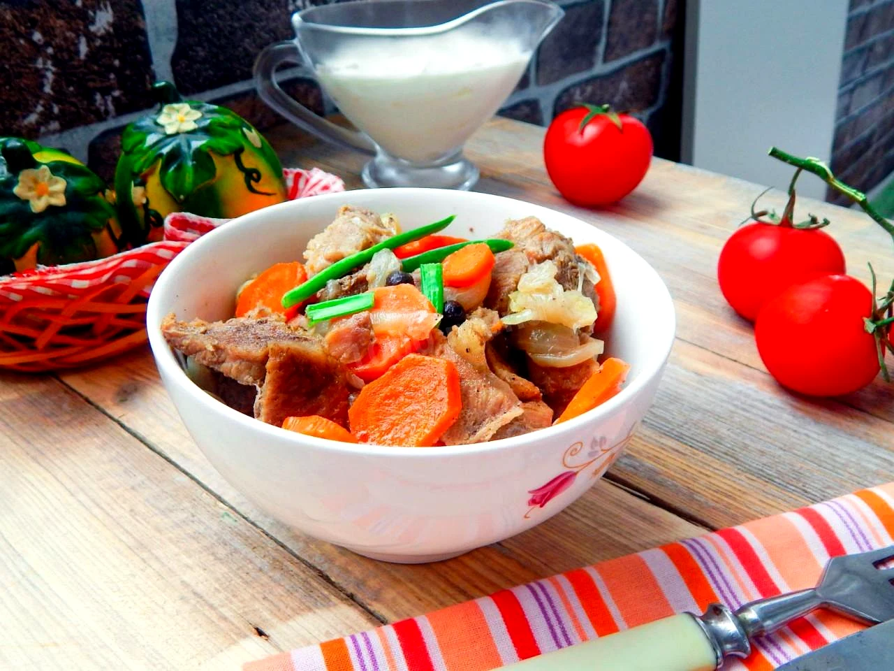 : Подавайте м'ясо як самостійну страву, полив бульйоном зі сковороди Або з будь-яким гарніром. Яловичина з морквою буде смачна і з пюре, і з макаронами, з кашами або зі свіжими овочами або салатом з них. Приємного апетиту!