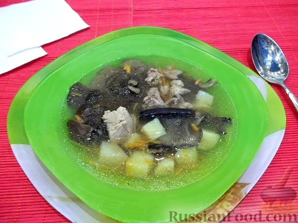 Рецепт Грибний суп з м'ясом, склад: гриби свіжі заморожені, свинина, картопля, морква, часник, цибуля ріпчаста, перець запашний горошком, лавровий лист, перець чорний мелений, сіль;, Рецепти перших с…