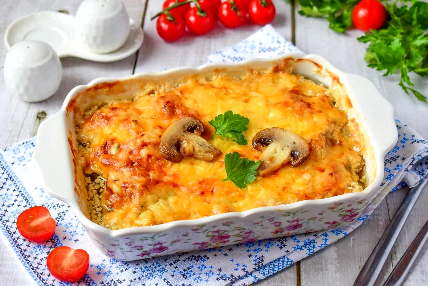 Гриби в духовці з сиром та куркою