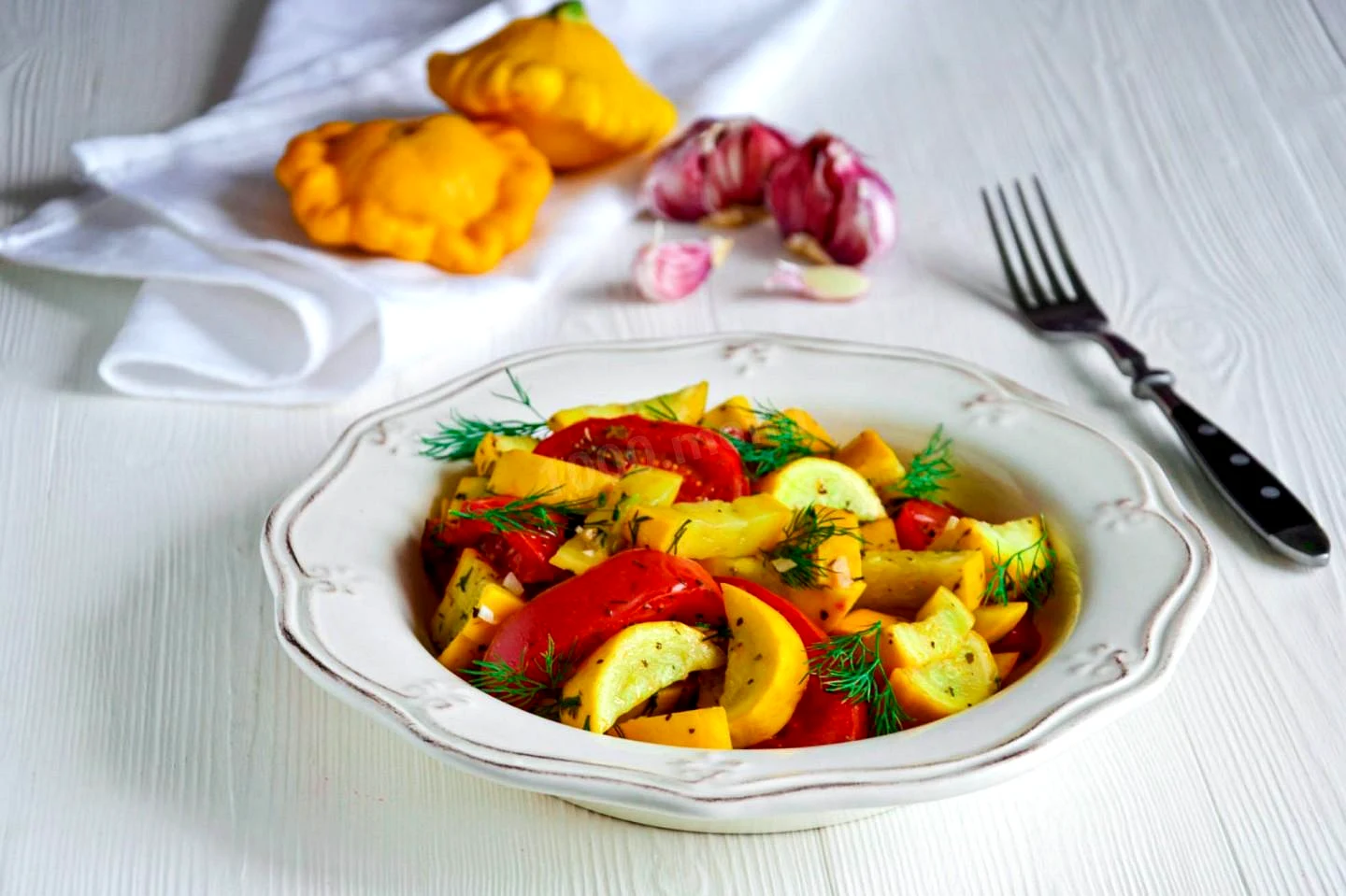 : Додайте до овочів пропущений через прес часник і рубаний свіжий кріп, перемішайте і тушкуйте разом ще 2-3 хвилини на слабкому вогні.
