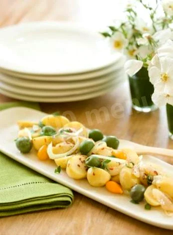 Інгредієнти−5 порцій+Продукти (5 порцій)Картопля0.5 кгЗелена цибуля2 грОливки10 шт.Каперси2 грФета150 грКріп1 стол.л.Йогурт50 грОливкова олія1 стол.л.Лимонний сік1 стол.л.Цукор0.5 чайн.л.