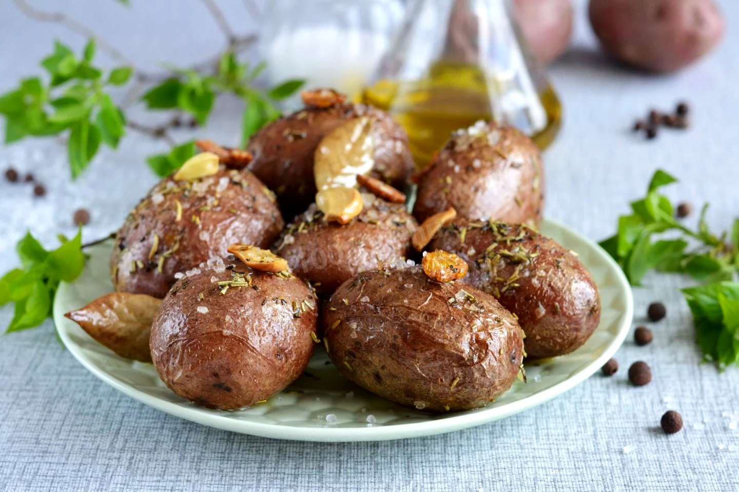 : Переверніть бульби За допомогою пензлика змастіть бульби оливковою олією з дна форми. Зверху посипте картоплю морською сіллю та сушеними травами. Розкладіть навколо картоплі часник та лаврове листя. Поверніть картопля в духовку і запікайте ще близько 20-25 хвилин до готовності. Якщо картопля пропікається погано, накрийте форму фольгою.