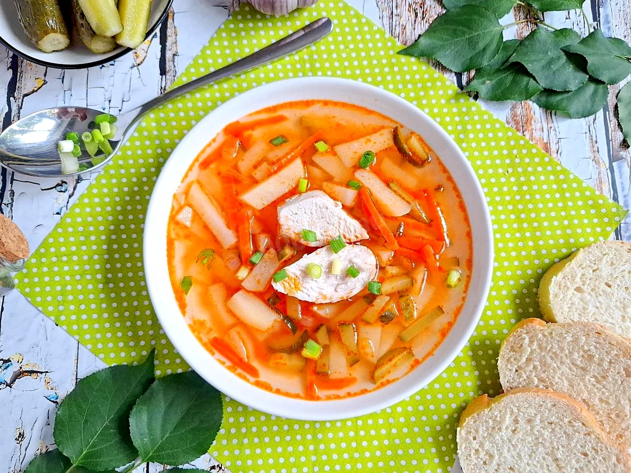 : Розсольник з картоплею та куркою подавайте гарячим, виклавши в тарілку шматочки м'яса і посипавши свіжою зеленню. До розсольника можна подати свіжий хліб чи хрусткі грінки. Приємного апетиту!