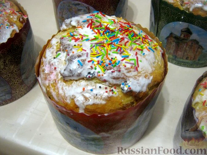 Рецепт Кулич Пасхальний домашній, склад: На 1 кг борошна: молоко (375 мл), дріжджі сухі активні (11 г), яйця, вершкове масло, маргарин, цукор (300-400 г), сіль, родзинки, цукати, цукор ванільний, цед…