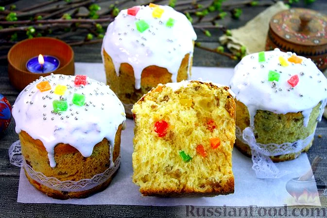Рецепт Паски-бріоші на молоці, склад: Тісто: жовток, цукор, борошно, масло вершкове, сіль, мед, цукор ванільний; Опара: борошно, сухі дріжджі, молоко, цукор; Глазурь: яєчний білок, цукрова пудра, сік…