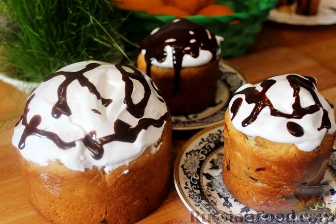 Рецепт Паски зі шматочками шоколаду та шоколадною глазур'ю, склад: яйця, маргарин, вершки 10 %, дріжджі сухі швидкодіючі, борошно, цукор, ванілін, сіль, шоколад темний (гіркий); Для білої глазурі: яє…