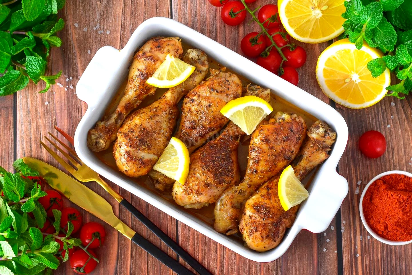 Запеките ароматні курячі ніжки з маслом, лимоном і травами до золотистої скоринки! Цей простий рецепт дарує м'ясо, що тане во рту, і чудовий аромат на вашій кухні. Ідеально до обіду чи вечері.