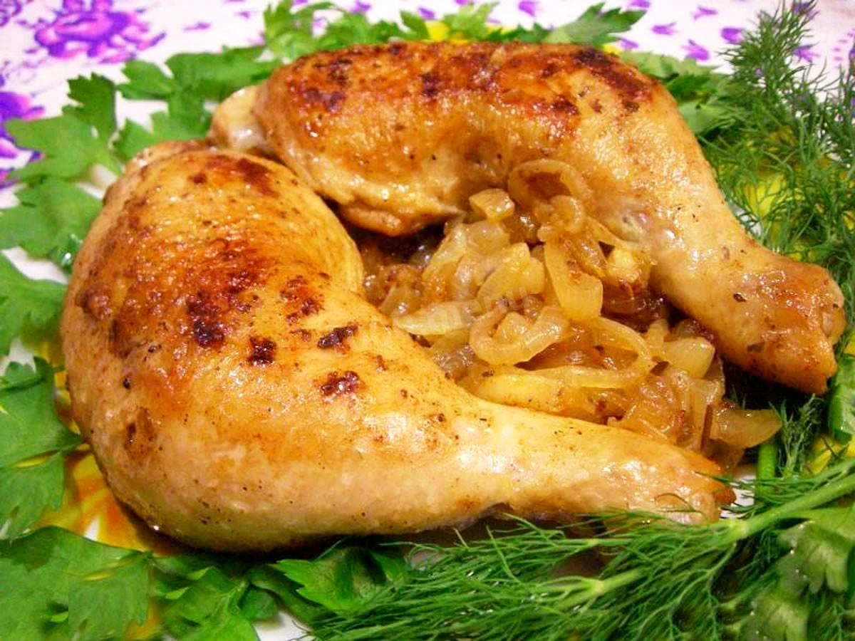 Курячі стегенця смажені з цибулею на сковороді