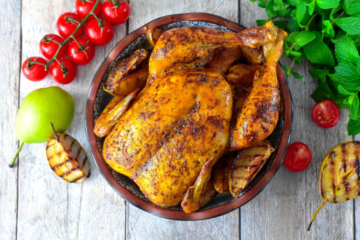 : Запечену курку перекладіть на блюдо разом із грушами і подайте до столу, прикрасивши свіжою зеленню. Приємного апетиту!