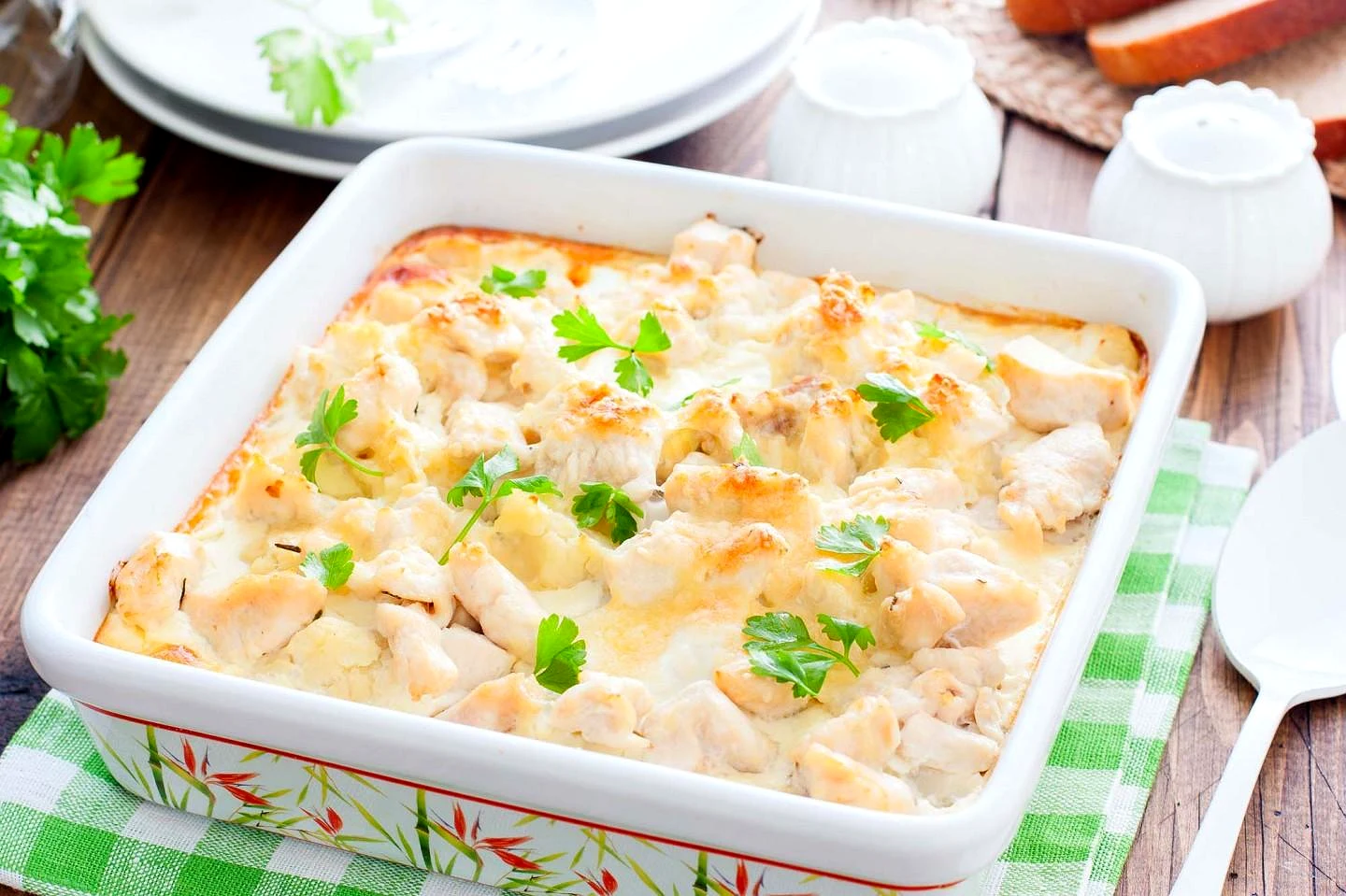 Приготуйте ароматну курку з цвітною капустою, запечену в духовці з вершками та сиром. Нежне м'ясо птиці поєднується з хрустким овочем у кремовому соусі. Простий рецепт для сімейного обіду, готується …
