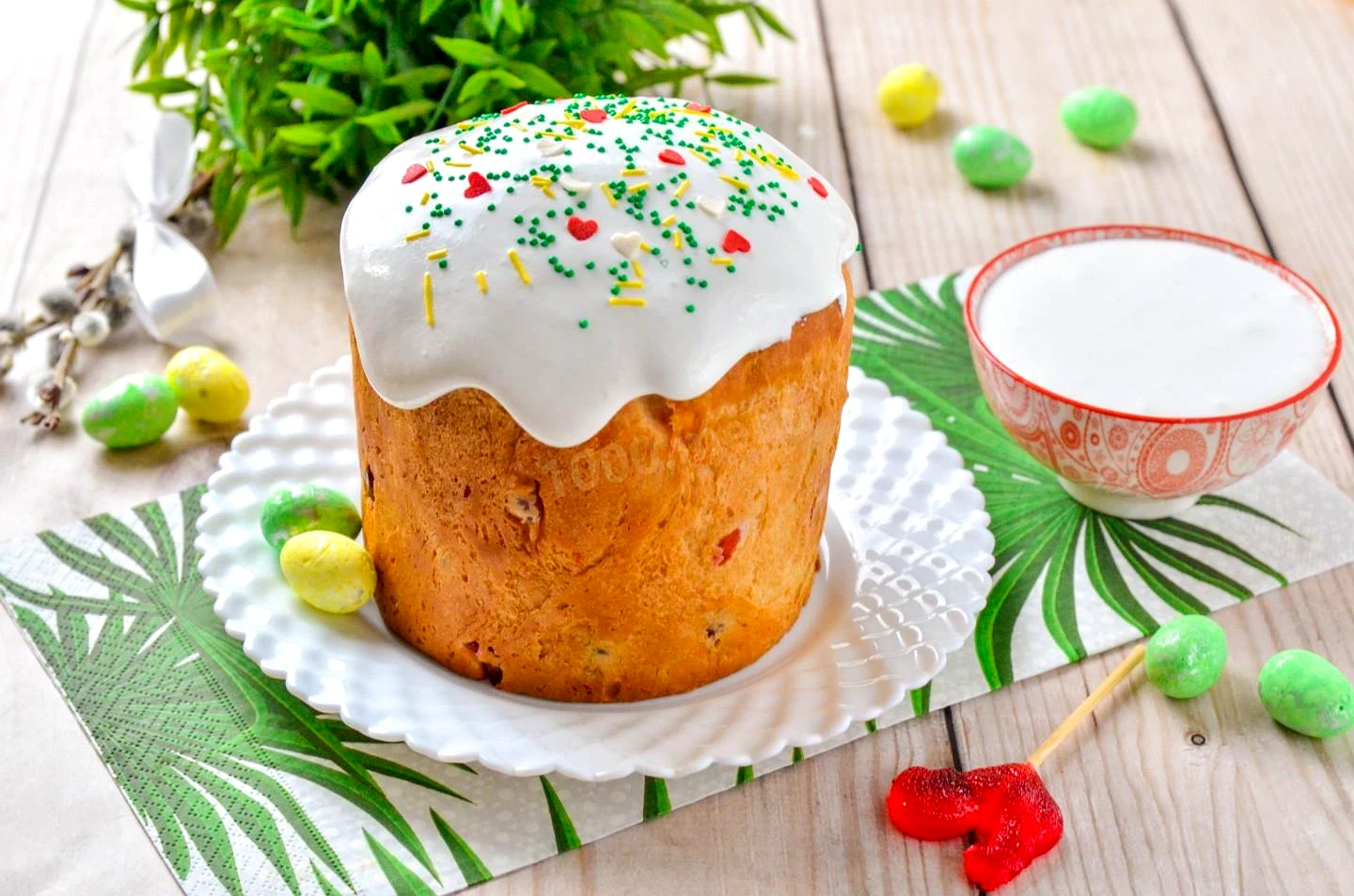 : Намажте білкову заварну меренгу, що вийшла, на паски. Вона спочатку буде липкою, тому паски треба буде залишити на відкритому повітрі до її застигання. На це піде близько 3-4 годин. Після цього глазур перестане липнути. А ось прикрашати паски з меренгою краще одразу, поки вона липка. Світлого свята!