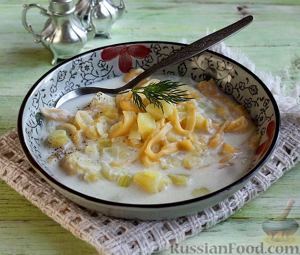 Рецепт Молочний суп з домашньою локшиною, склад: молоко, цибуля ріпчаста, картопля, масло вершкове, локшина домашня (приблизно), сіль, перець чорний мелений; Тісто для локшини: борошно, яйця, сіль, в…