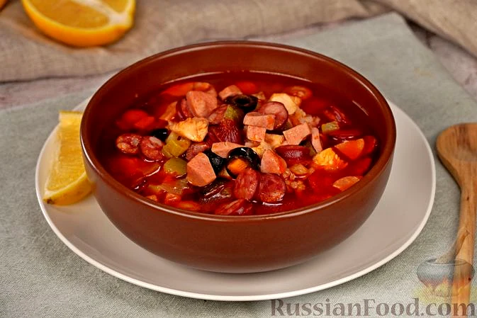 Рецепт М'ясна солянка з рисом, склад: сосиски молочні, ковбаски напівкопчені мисливські, куряче філе, рис, огірки мариновані, картопля, цибуля ріпчаста, морква, часник, лимон, олія, олія (без кісточо…