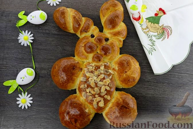 Рецепт Пасха "Кролик" з мигдалем та цукатами, склад: Для тесту: масло вершкове, сметана (або густий йогурт), молоко, яйця, борошно, дріжджі свіжі, цукор, цукор ванільний, кардамон мелений, сіль, олія…