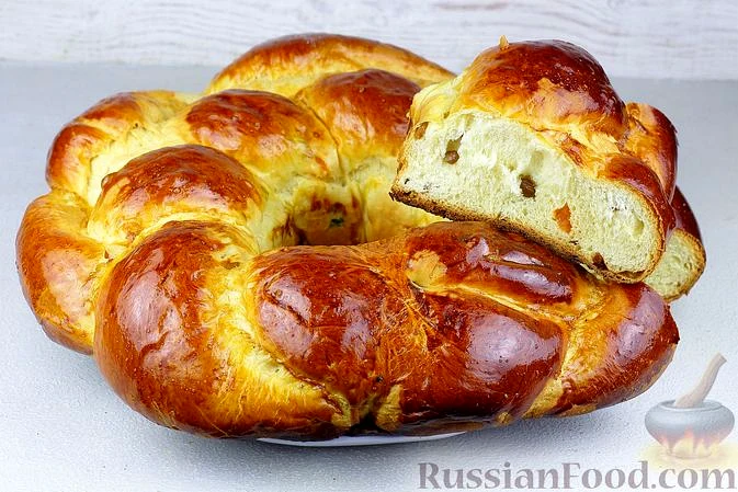 Великодній здобний пиріг-вінок з цукатами, родзинками та корицею