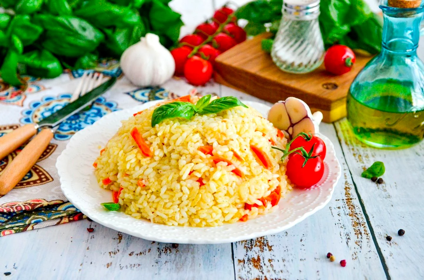 : І тільки після цього приберіть часник і перемішайте рис з овочами Плов без м'яса готовий. Можете подавати його до столу.
