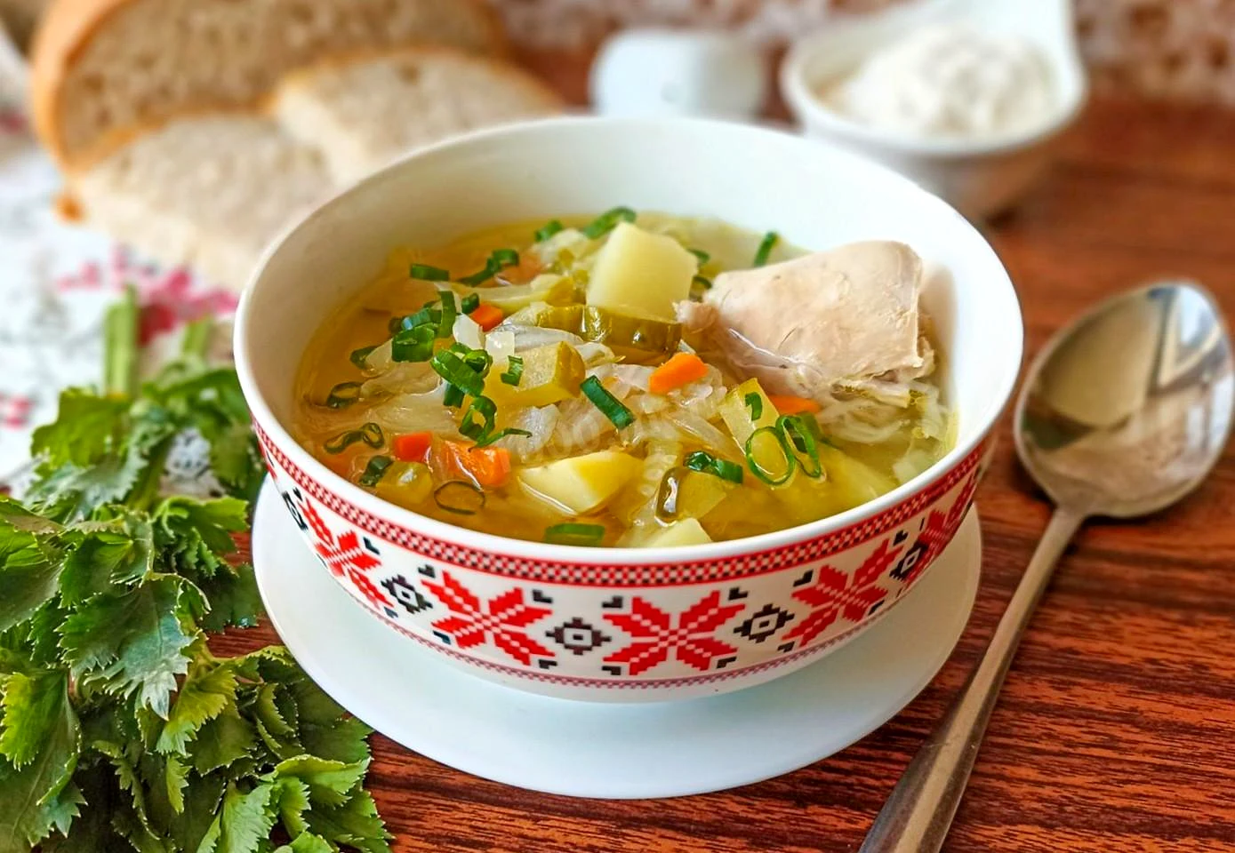 : Гасити суп на повільному вогні ще 10 хвилин, потім вимкніть вогонь. Дайте розсольнику настоятися під кришкою і подавайте на стіл зі сметаною та свіжою зеленню. Приємного апетиту!