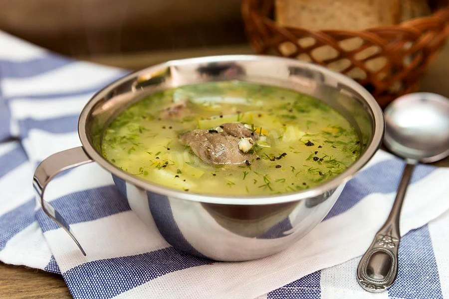 Інгредієнти−6 порцій+Продукти (6 порцій)Цибуля ріпчаста50 грМорква40 грПерловка80 грКартопля200 грЧасник10 грСолоні огірки400 грРозсіл50 млКріп20 грСвинина500 грМорква50 грВода3 л