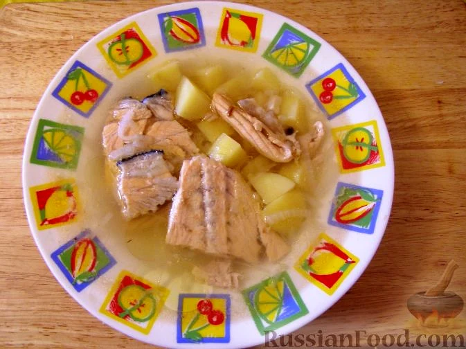 Рецепт Рибний суп з обрізу сьомги (рецепт поморської трапези), склад: сьомга (хвіст, хребет, голова), картопля (4 середні коренеплоди), цибуля ріпчаста (1 велика цибулина), олія рослинна (4 ст. ложки…