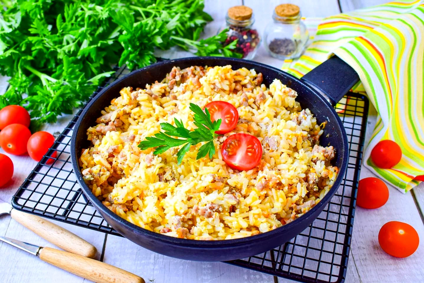 Рис з фаршем у сметані на сковороді