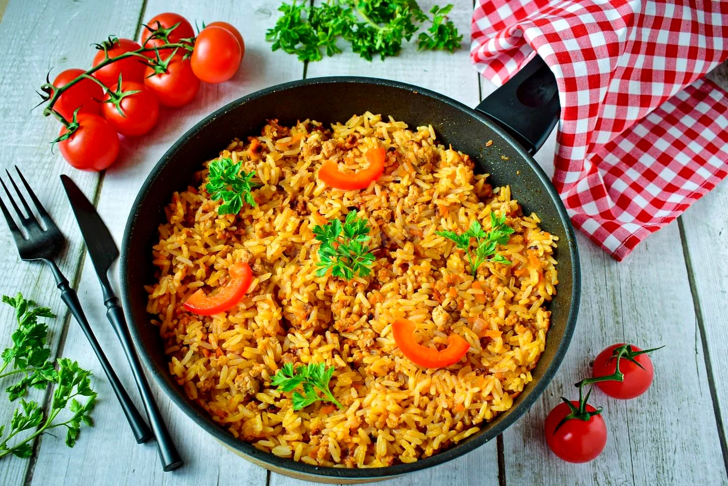 Рис з фаршем та томатною пастою на сковороді