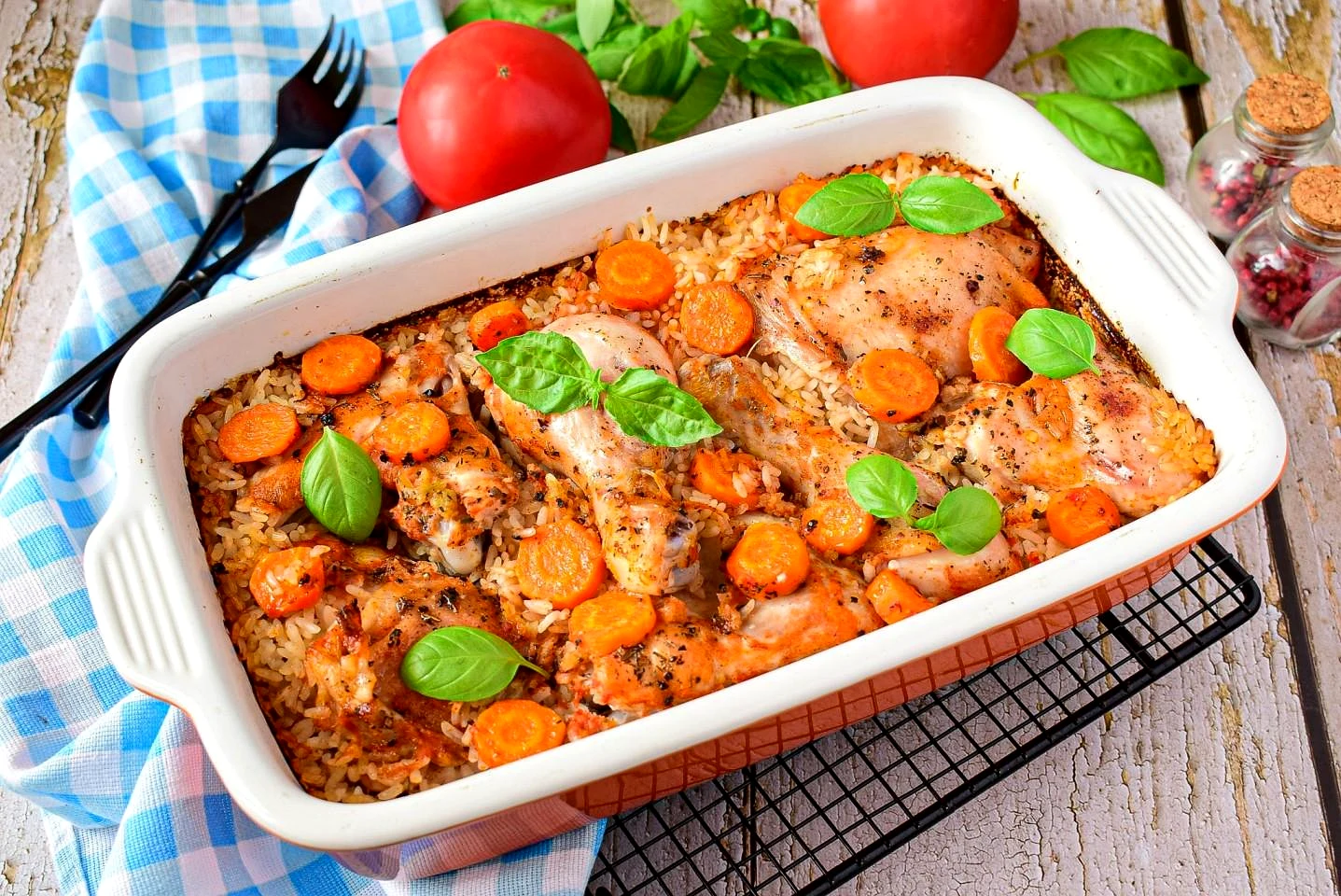 Запеціть ароматний рис з курицею в духовці - просте й смачне блюдо для сімейного обіду. Сочна курка, пропарений рис, помідори та часник створюють гармонійний смак. Готується без особливих клопотів!