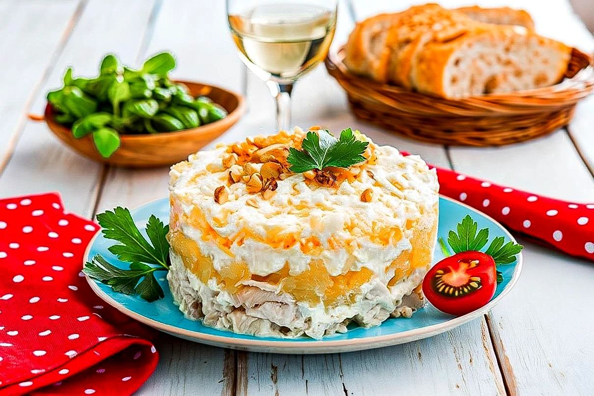 Приготуйте витончений салат з ніжного куриного філе, солодких ананасів, твердого сиру та яйця. Шарувата композиція з грецькими горіхами та майонезом створює неповторний смак. Ідеальна страва для свят…