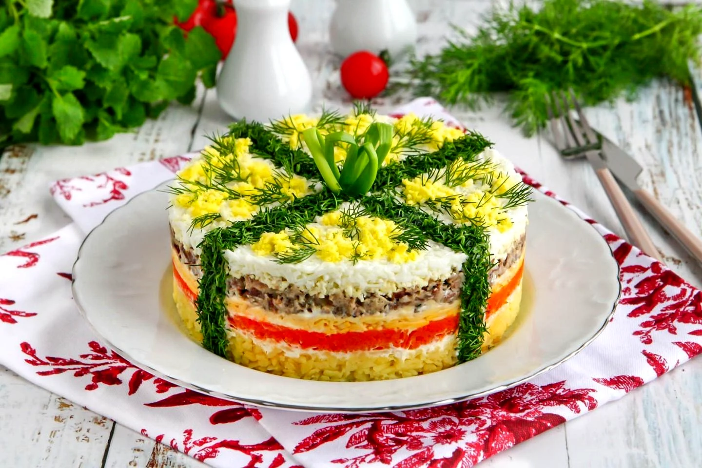 : Перед подачею прикрасьте салат зверху за бажанням і смаком, використовуючи подрібнену зелень і яєчні жовтки, що залишилися, натерті на дрібній тертці. Приємного апетиту!