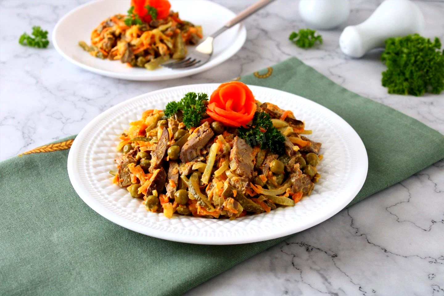 : У зручній ємності з'єднайте всі підготовлені інгредієнти: печінку, обсмажені овочі, зелений горошок, солоні огірки. Заправте салат майонезом, перемішайте. За потреби трохи посоліть салат.