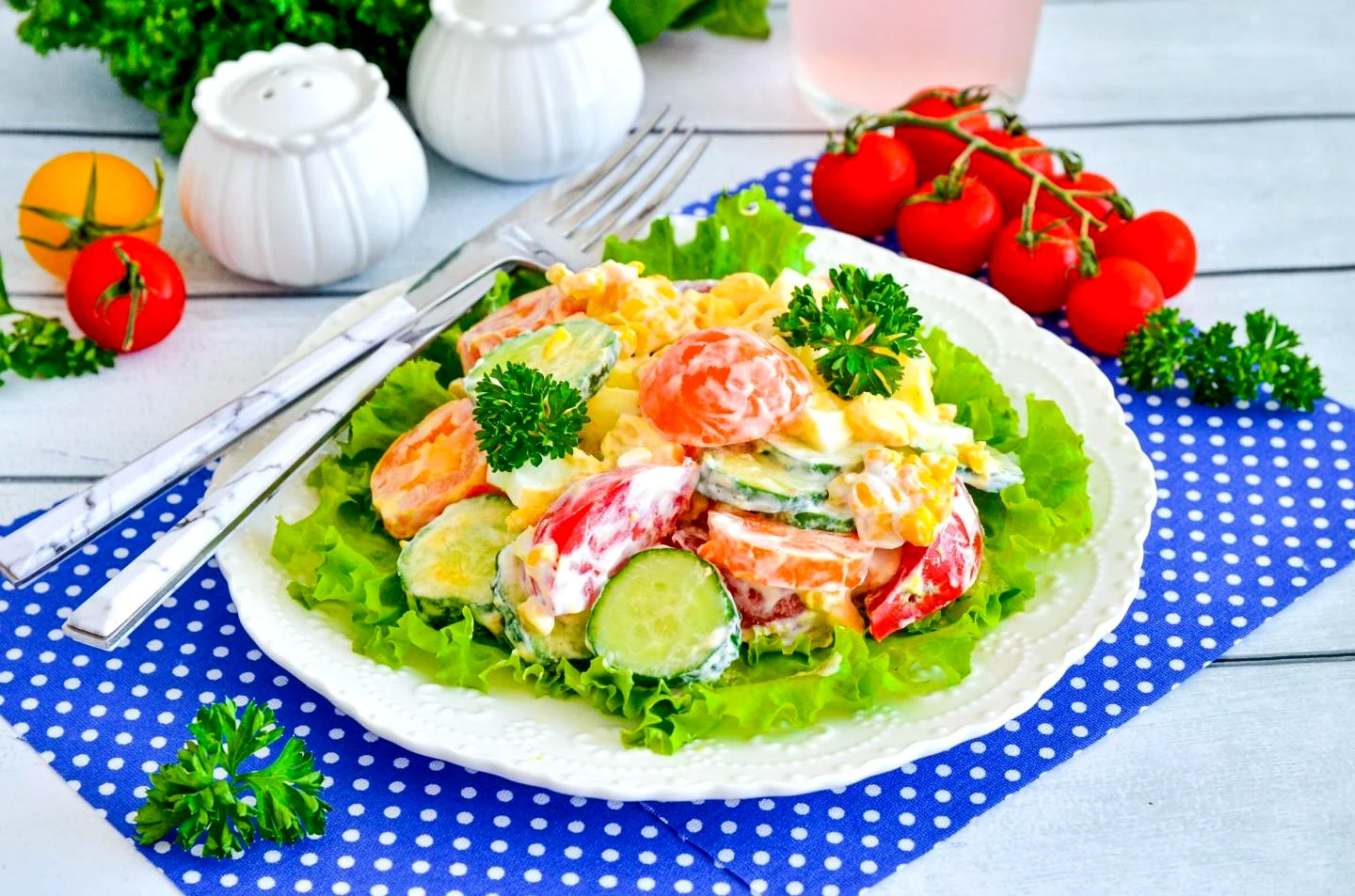 Приготуйте легкий і свіжий салат з хрусткими огірками, соковитими помідорами та солодкою кукурудзою. Додайте варені яйця та кремову сметану для неповторного смаку. Ідеальний вибір для літнього обіду …