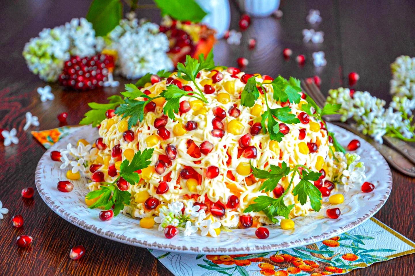 Як прикрасити салат перед подачею? Обсипте салат зернами гранату та кукурудзи та прикрасьте гілочками петрушки. Готовий салат поставте на 20-30 хвилин у холодильник для просочення. Приємного апетиту!