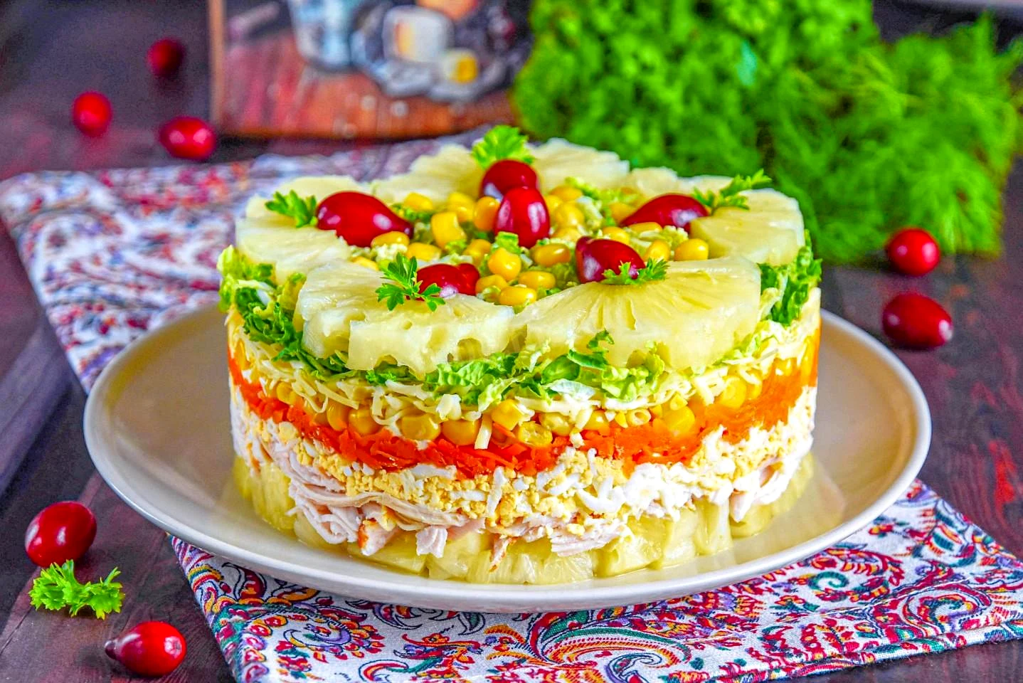 Как украсить салат? Готовый салат украсьте ананасами, зернами кукурузы, свежей зеленью и яркими ягодами. Поставьте салат на 1 час в холодильник. Перед подачей кулинарное кольцо аккуратно снимите. Приятного аппетита!