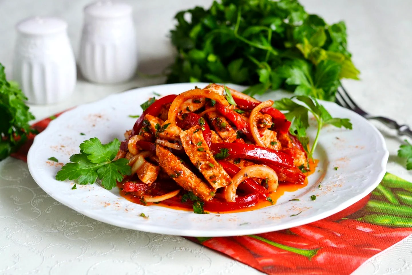 Приготуйте освіжаючий салат з ніжним куриним філе та хрумкими болгарськими перцями! Яскрава овочева композиція з петрушкою, пряними спеціями та соєвим соусом створить ідеальну легку страву для обіду …