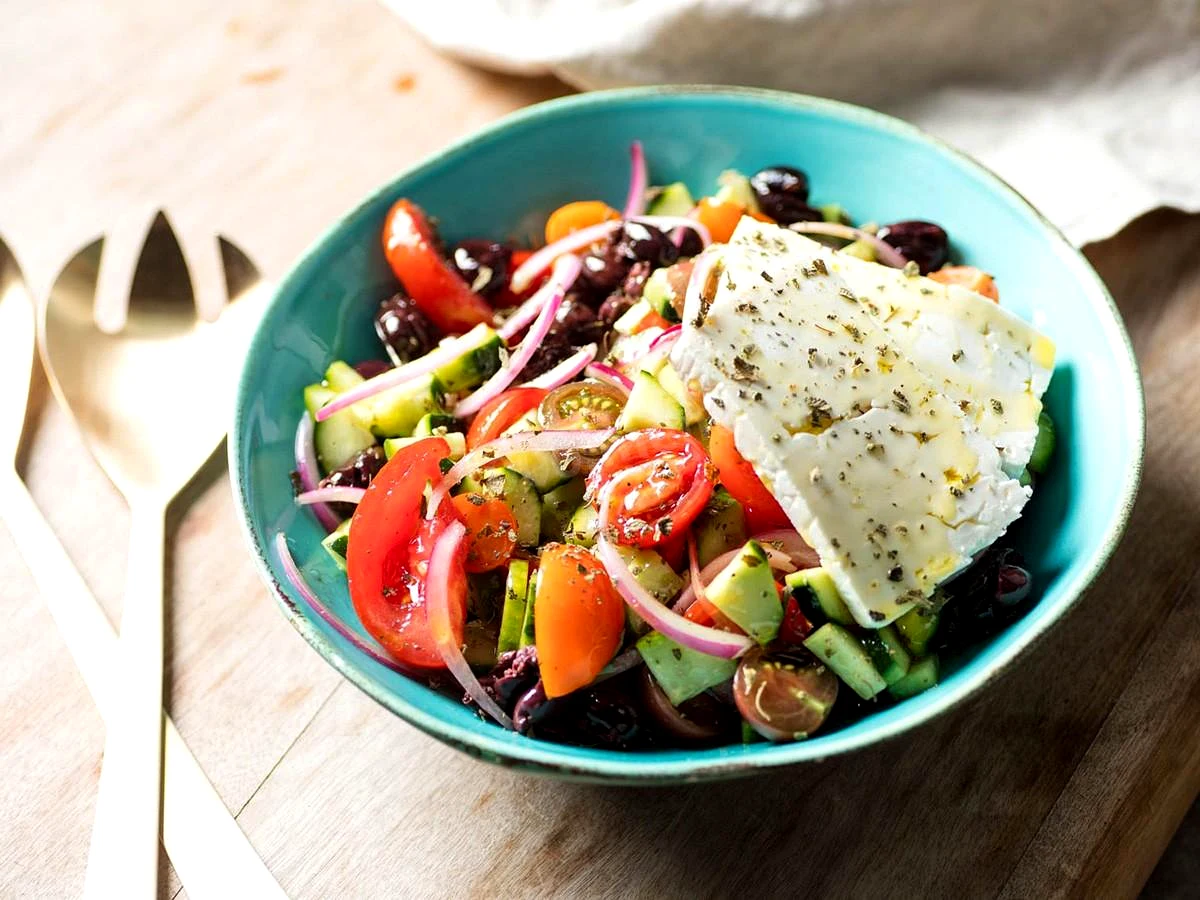 Інгредієнти−4 порції+Продукти (4 порції)Овечий сир115 грЦибуля55 грВиноградний сік60 млПомідори340 грОгірки340 грМаслини50 грОливкова олія120 млОрегано свіжий15 гр