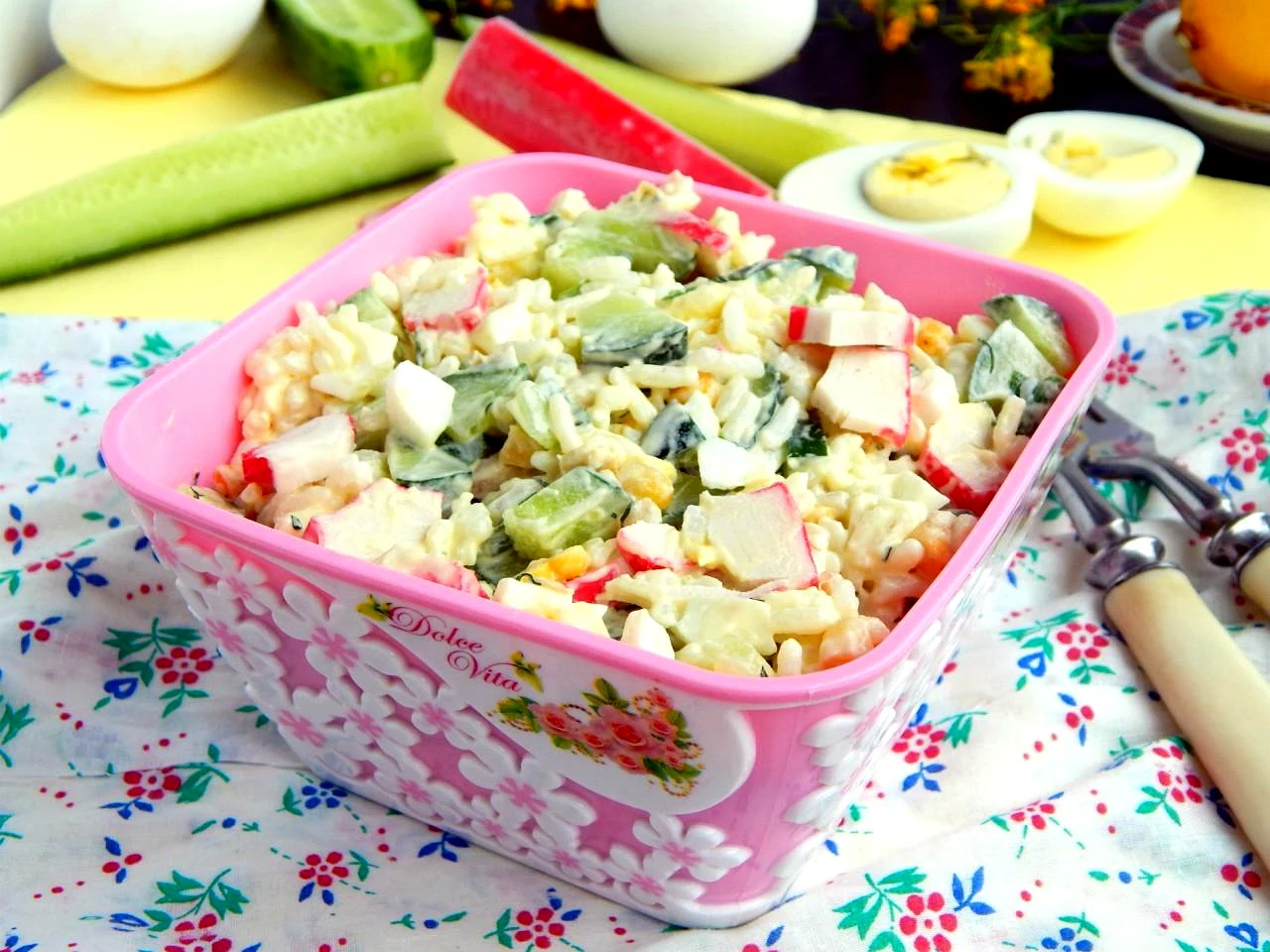 Салат з рисом, крабовими паличками, огірком та кукурудзою