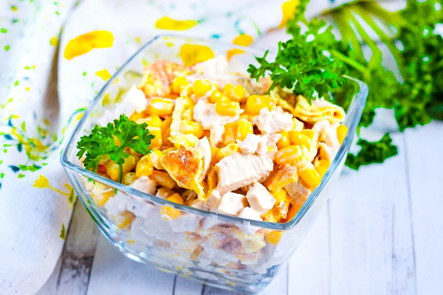 Приготуйте легкий та смачний салат з нитковим куриним філе, хрусткою кукурудзою та ніжними яєчними млинцями. Цей витончений рецепт ідеально поєднує свіжість овочів з яйцем і майонезом для безпечного …