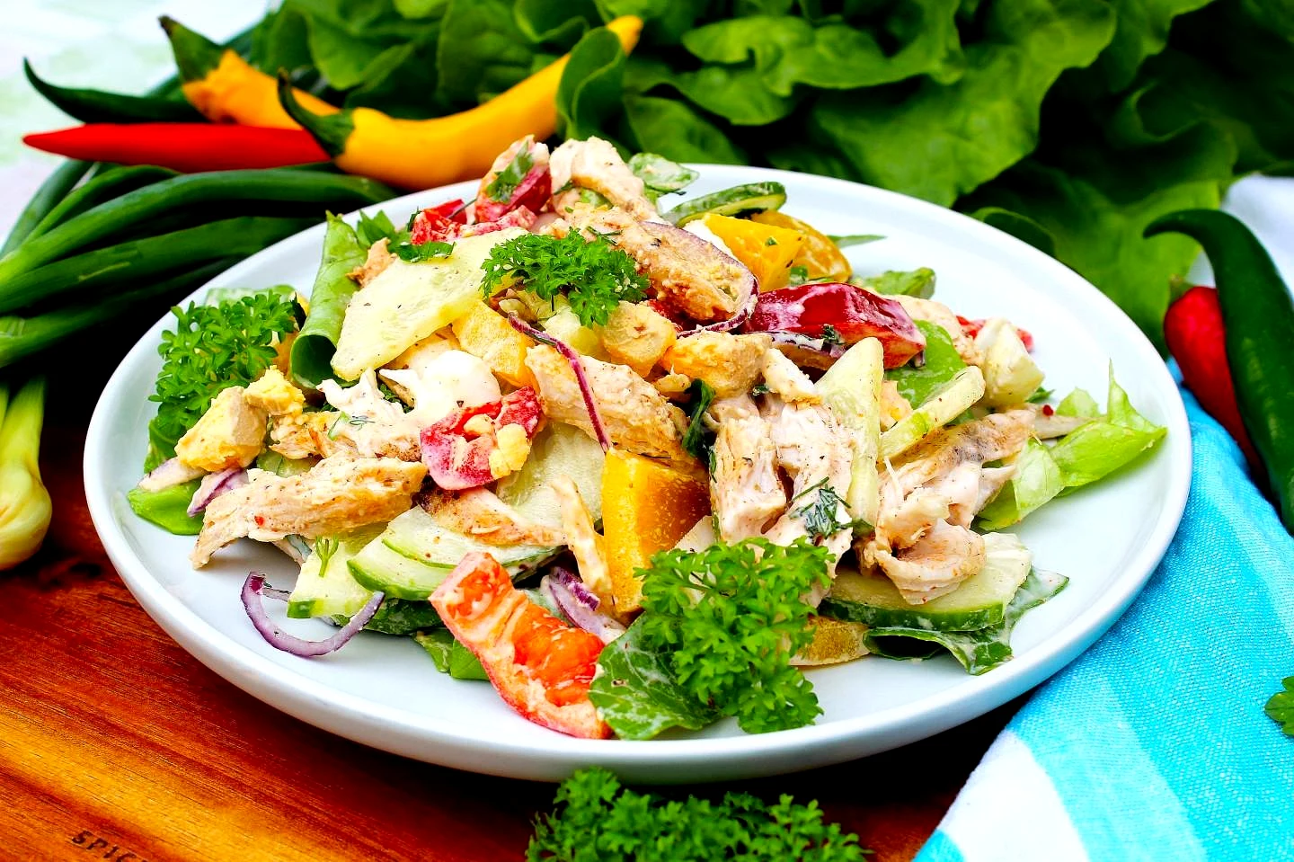 Приготуйте смачний салат зі смаженою курячою грудинкою, свіжими овочами та яйцями. Хрустка курка в поєднанні з хрусткими огірками, ароматним перцем і листям салату створюють ідеальну легку страву для…