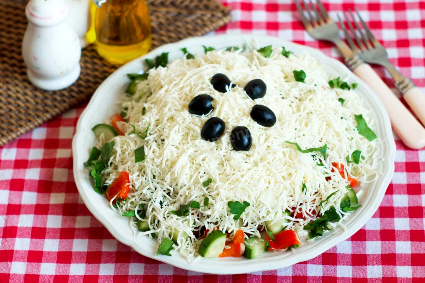 : Бринзу натріть на дрібній тертці Викладіть подрібнену бринзу на овочі акуратною "шапочкою". Петрушку промийте, струсіть, дрібно наріжте і викладіть на краю тарілки. Прикрасьте шопський салат класичний болгарський маслинами (або оливками). Їх можна покласти цілими чи нарізати на половинки.