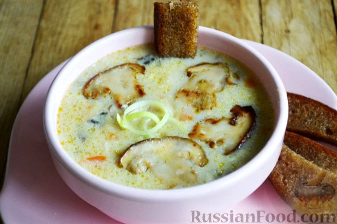 Рецепт Вершковий суп з білими грибами, склад: гриби білі заморожені, вершки 10%, цибуля-порей, цибуля ріпчаста, морква, макарони дрібні (ріжки, різони), масло вершкове, борошно, цибуля ріпчаста сушен…